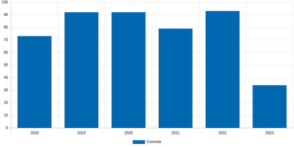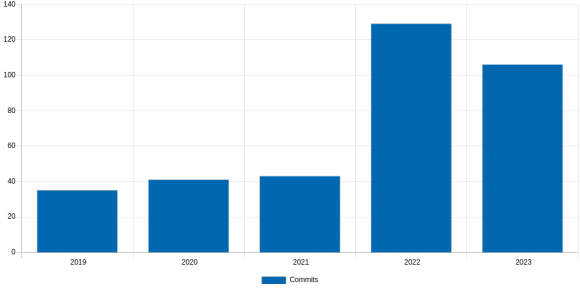 Since I started tracking the GCC support we have been getting a quite stable number of contributions, 70-100 per year. Though in 2023 (even if we are counting only 8 months on this chart), we are way below 40.